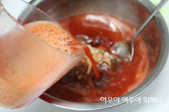 재료:파프리카2개,고춧가루18술,설탕10술,물엿8술,청주15술,다진마늘1술(마늘4쪽다진것)