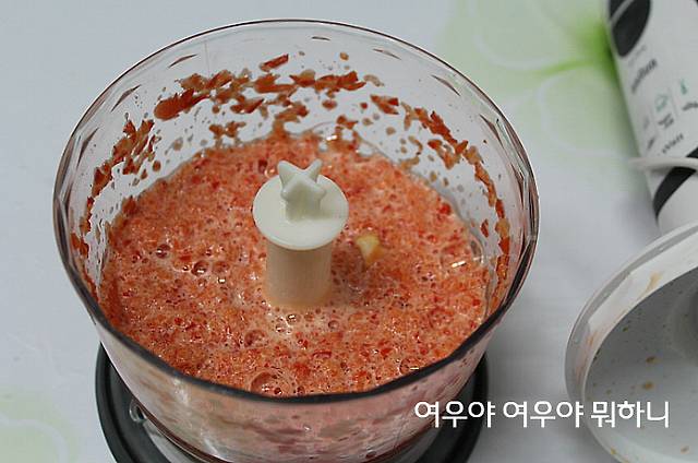 파프리카를 갈아서 즙을 넣어주는데 2개를 갈면 약 200cc의 양이 나오네요