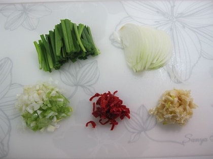 대파, 마늘은 다지고 홍고추는 잘게 썰어 준비합니다.