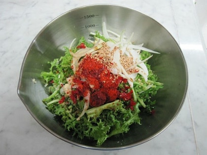 양념: 고춧가루, 맛간장, 다진 파.마늘, 홍고추, 양파청, 식초, 통깨